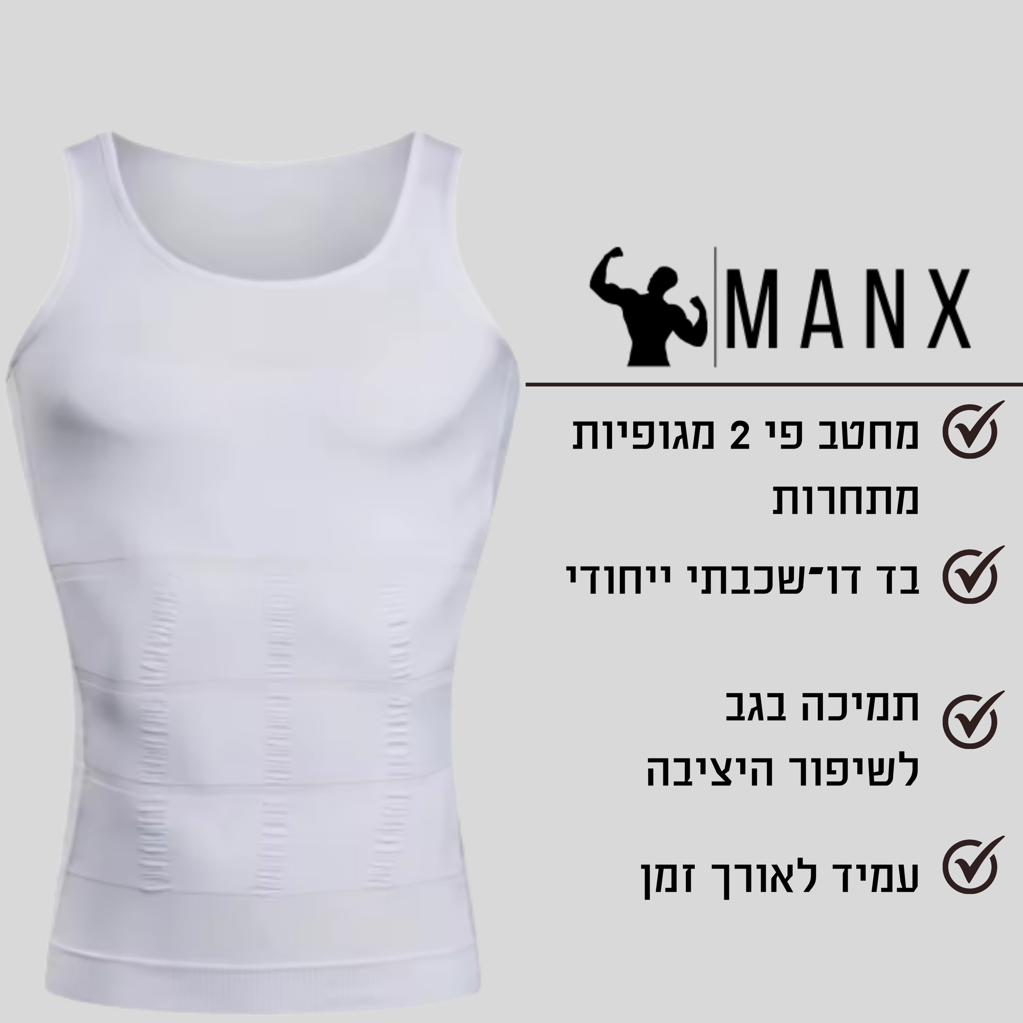 MANX היא גופייה מחטבת איכותית לגברים, שעוזרת לעצב את הגוף, להסתיר בטן וחזה, וליצור מראה חטוב ומוקפד. עשויה מבד נושם ועמיד, עם טכנולוגיית דחיסה מתקדמת לשיפור היציבה והתמיכה. מתאימה ליום-יום ולאימונים – נראית טבעי מתחת לכל חולצה.